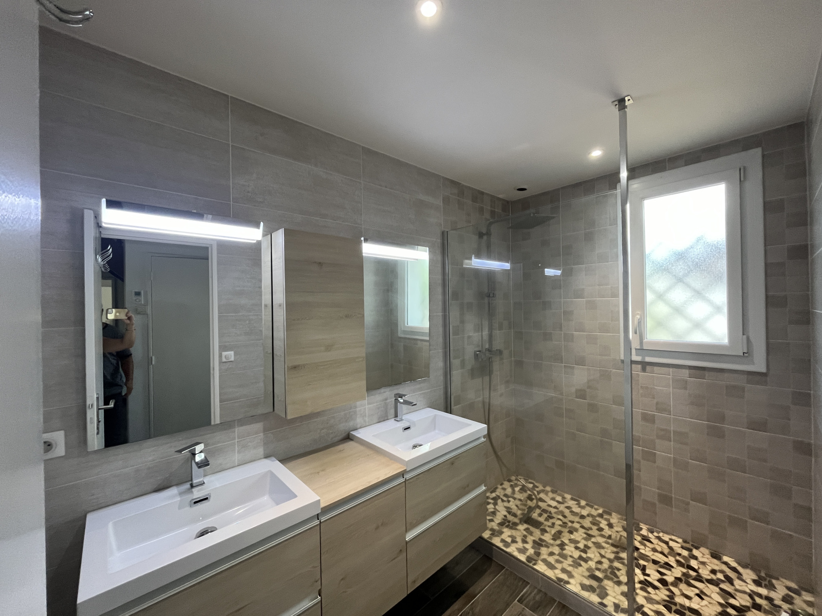 Salle de bains avec meuble double vasque et douche à l'italienne.