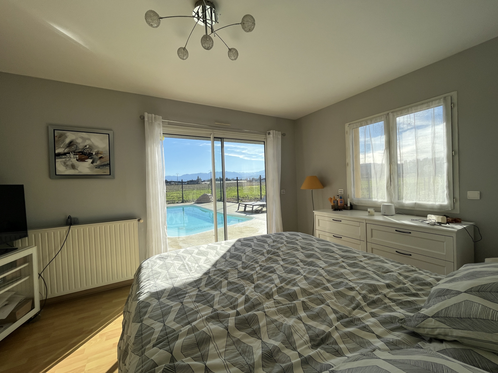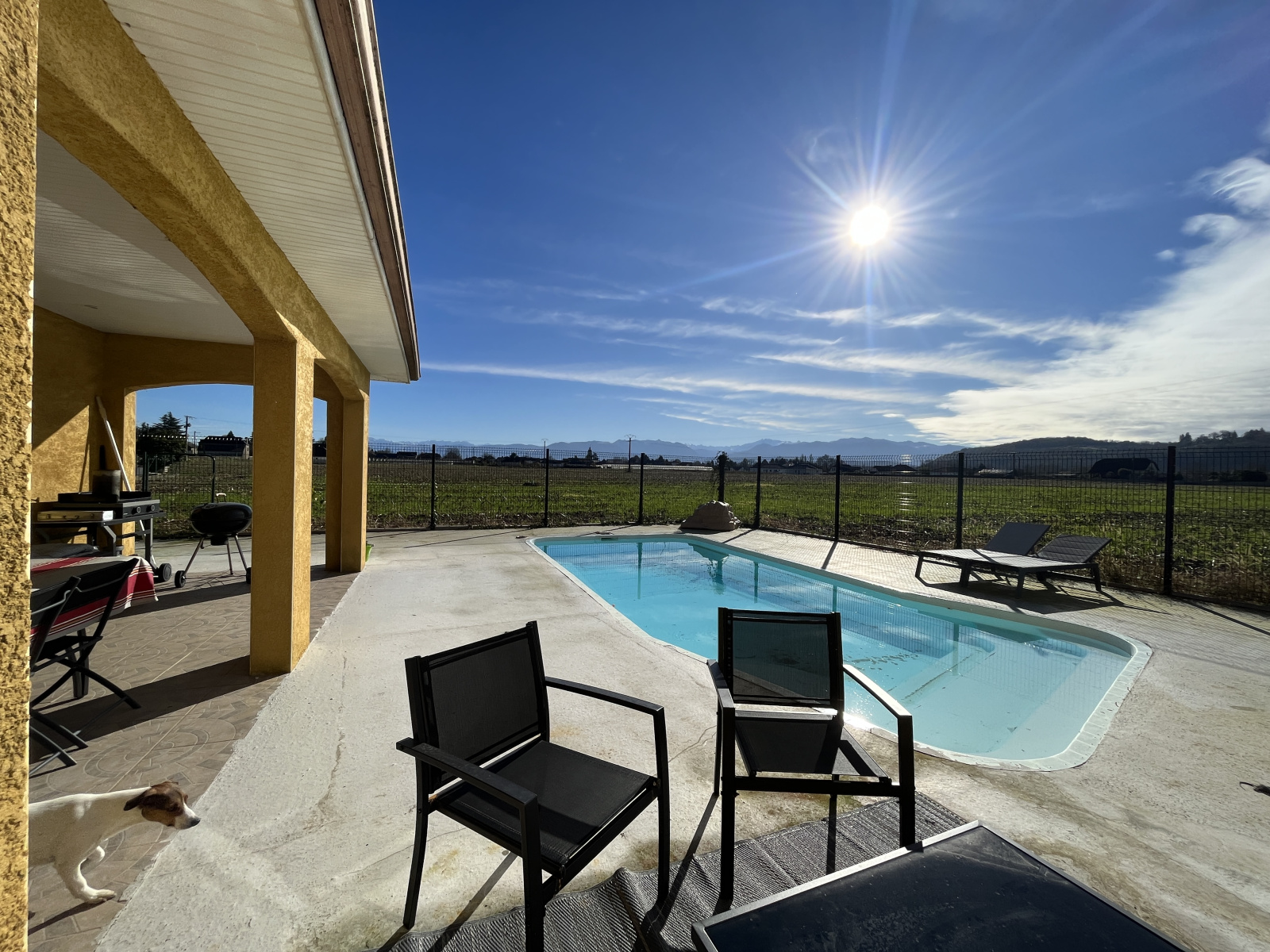 La maison est agrémentée d'une belle terrasse couverte donnant sur la piscine et le tout sans vis à vis, face aux Pyrénées.