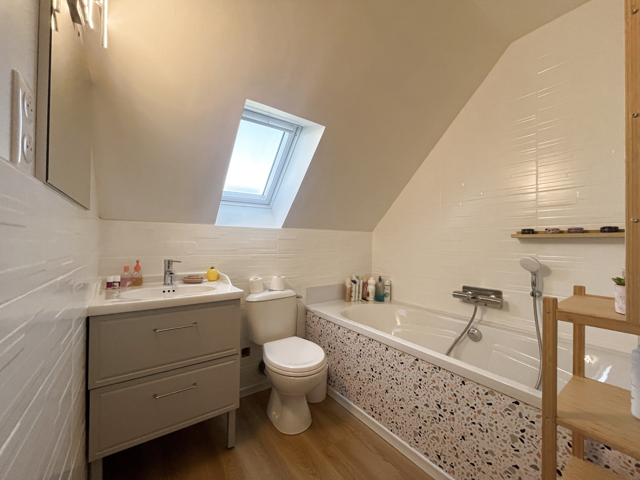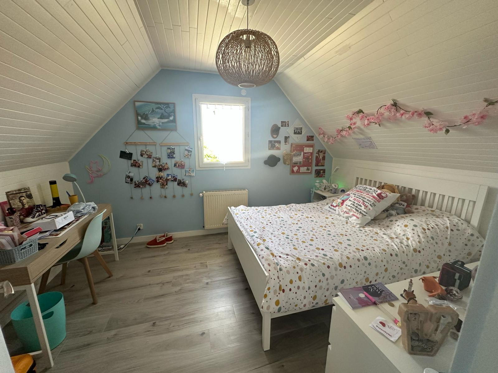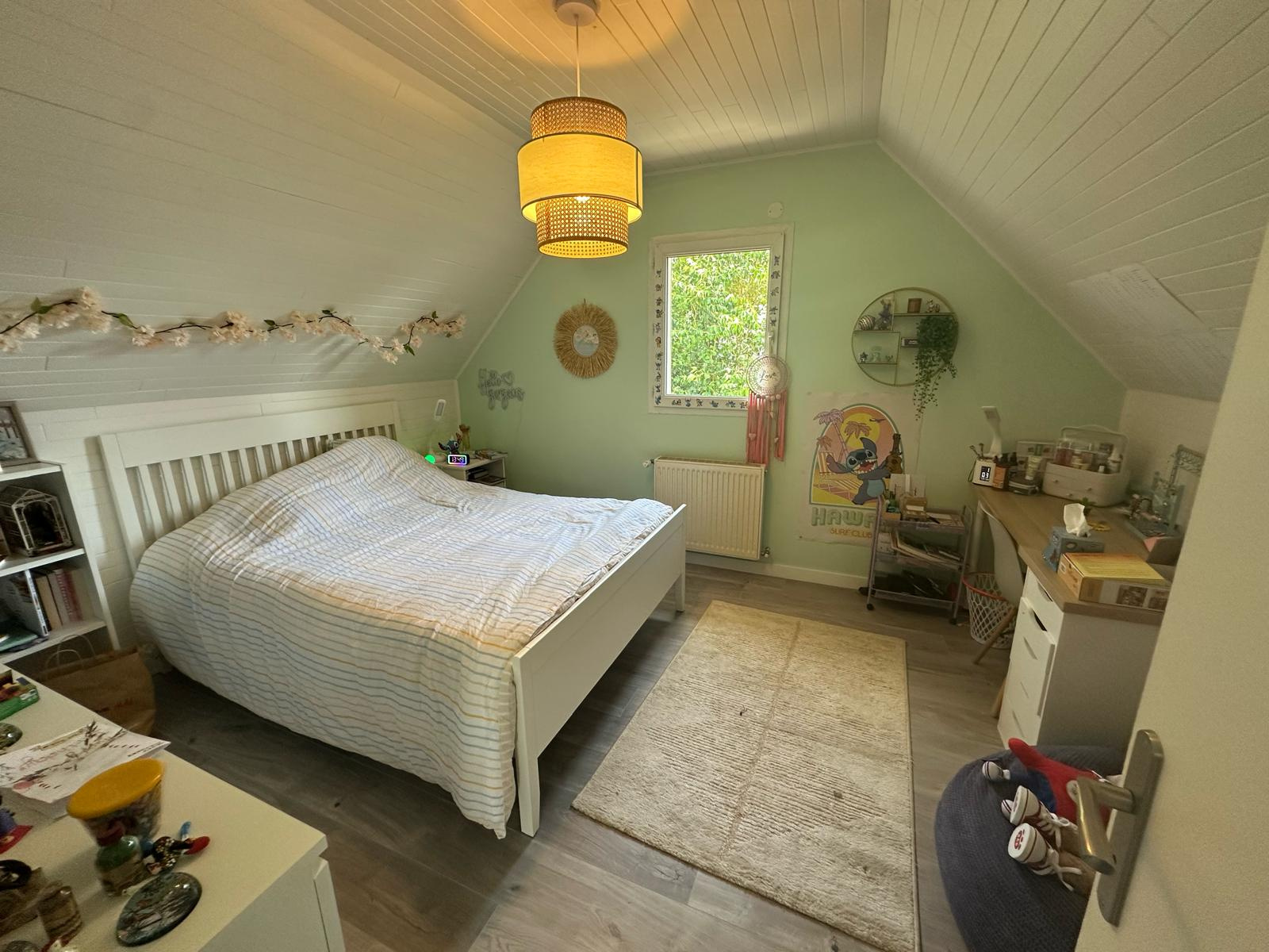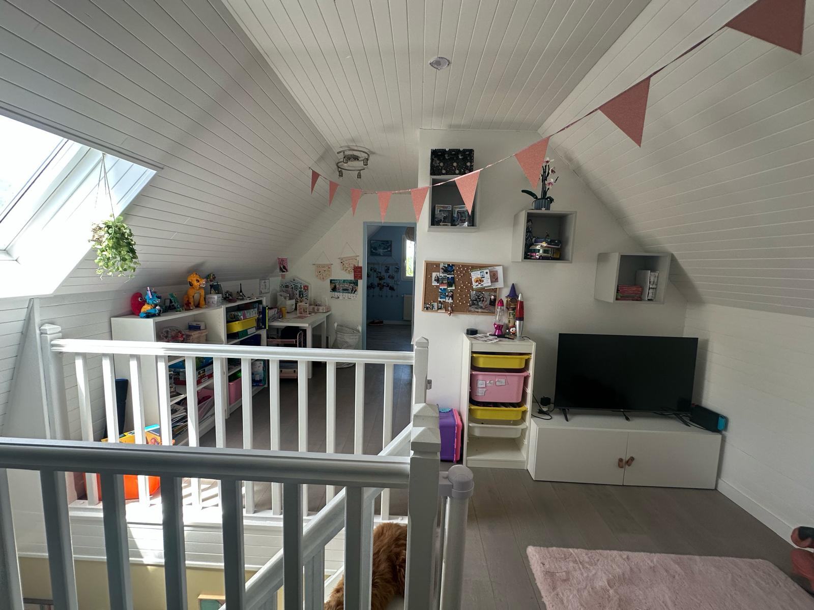 A l'étage une vaste mezzanine, deux belles chambres un wc séparé et une salle de bains.
