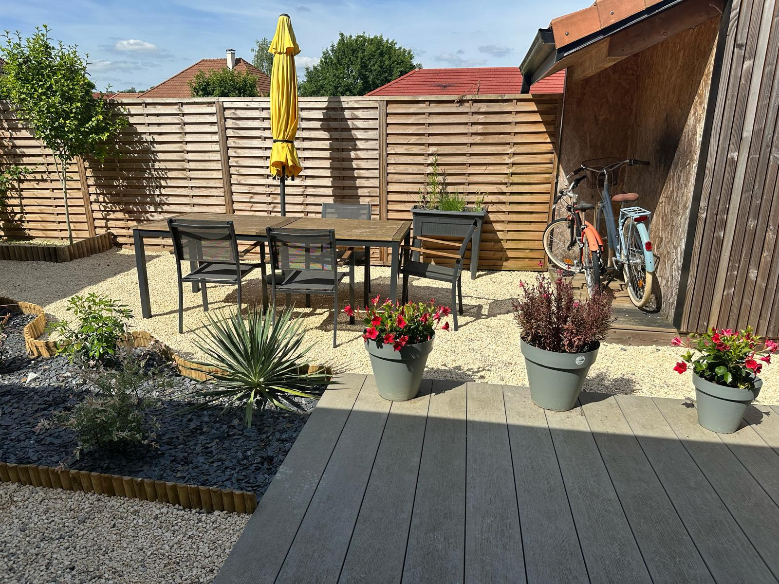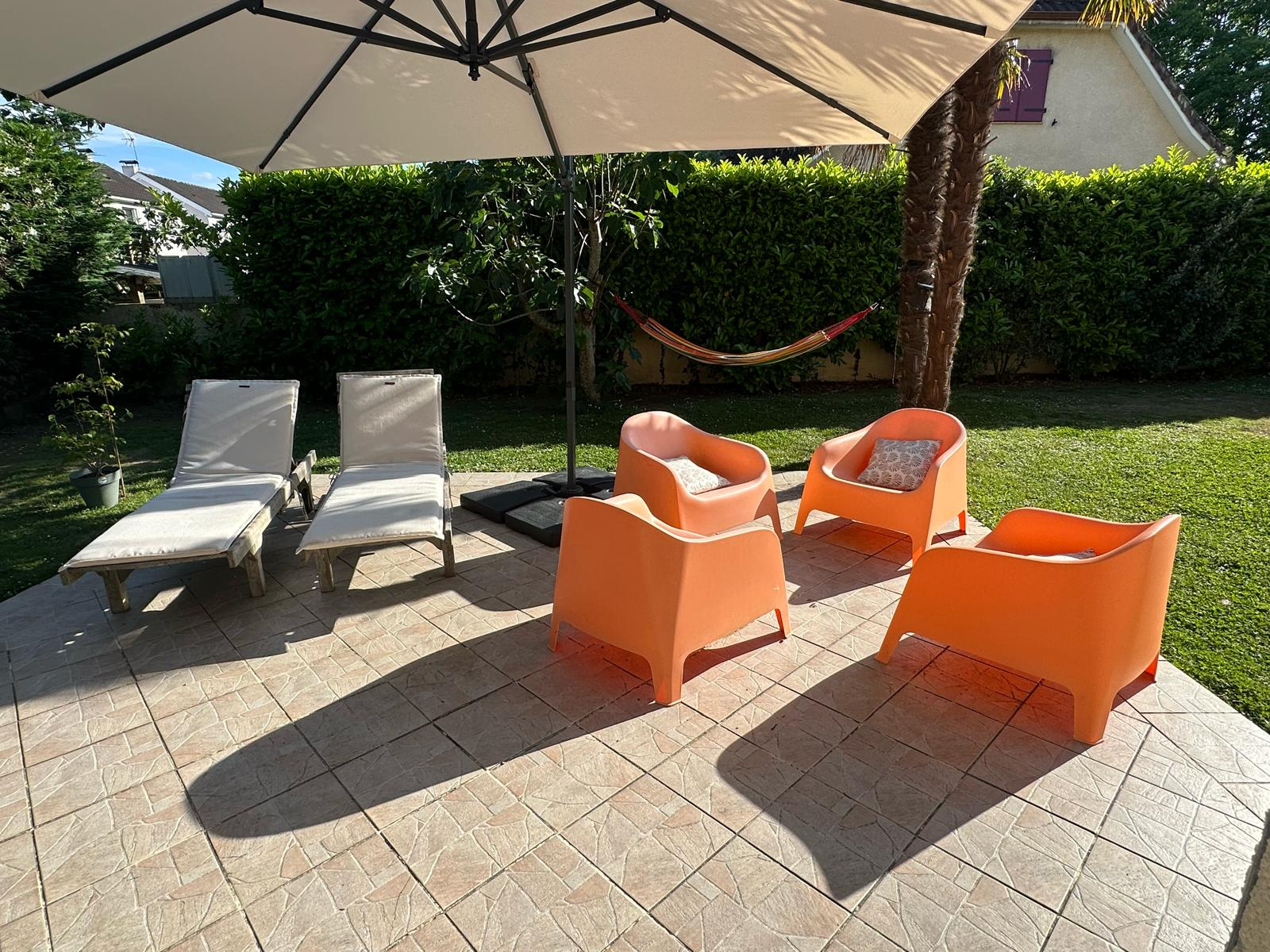 Le tout sur une parcelle de terrain de 1000 m2 avec deux terrasses l'une communiquante avec la cuisine et la seconde avec le salon.