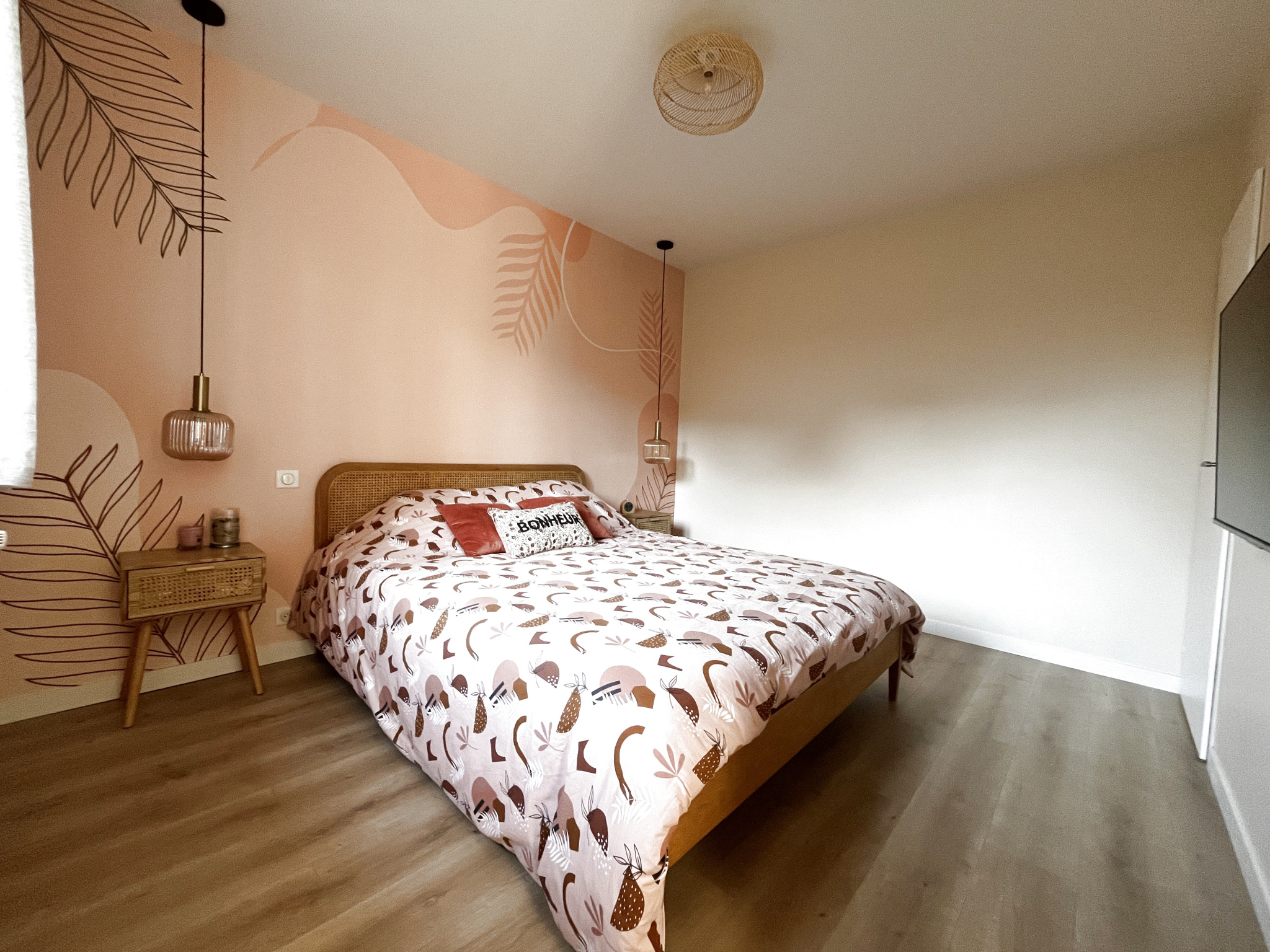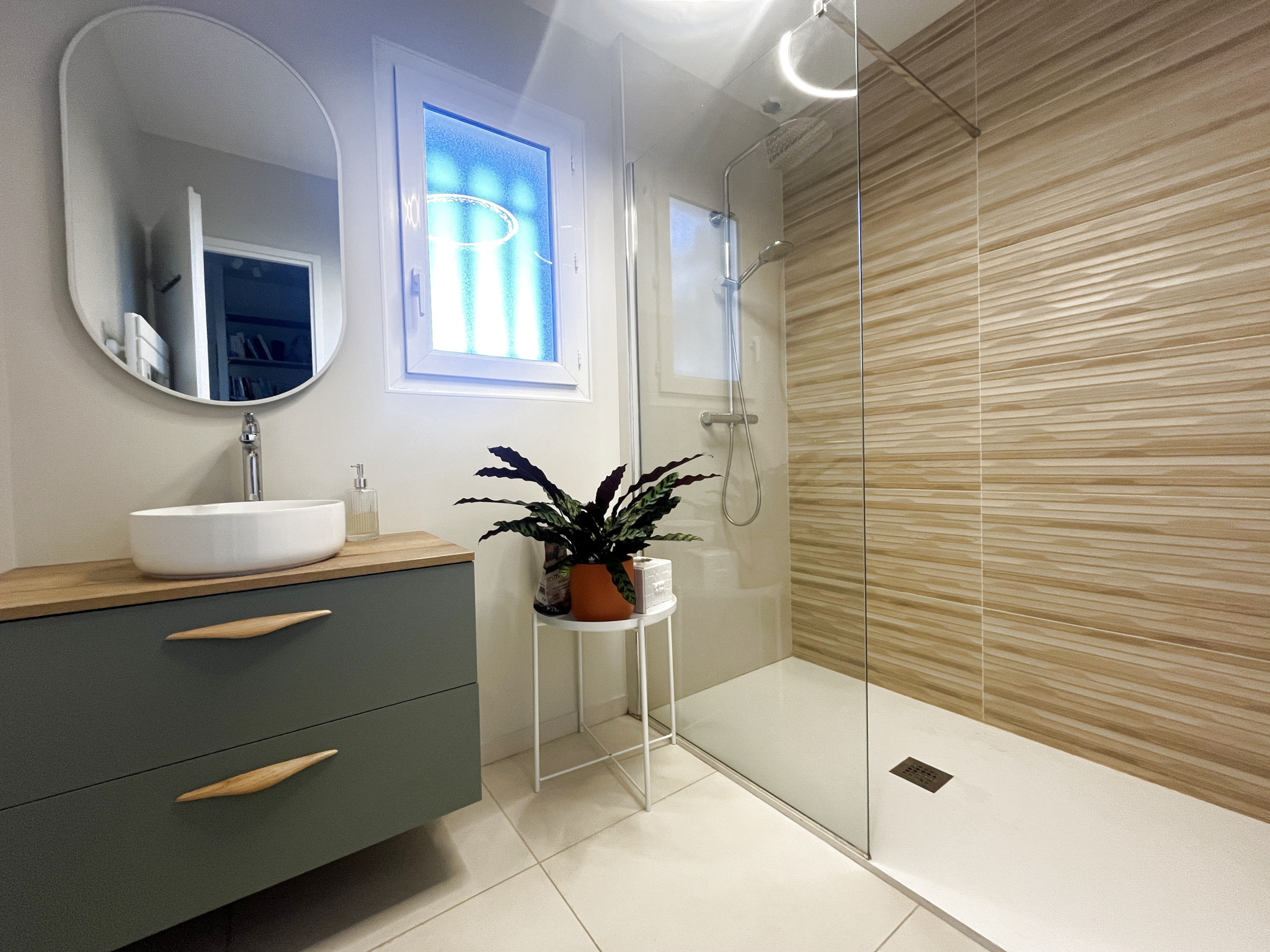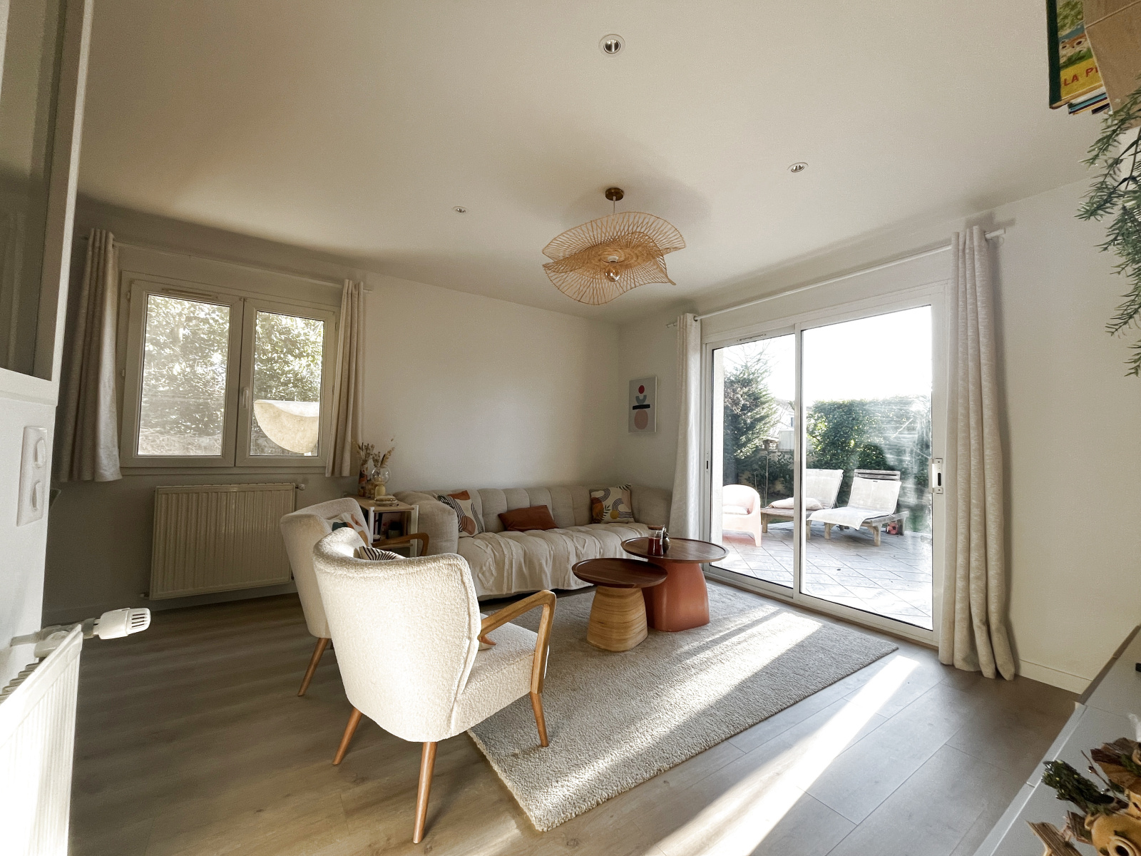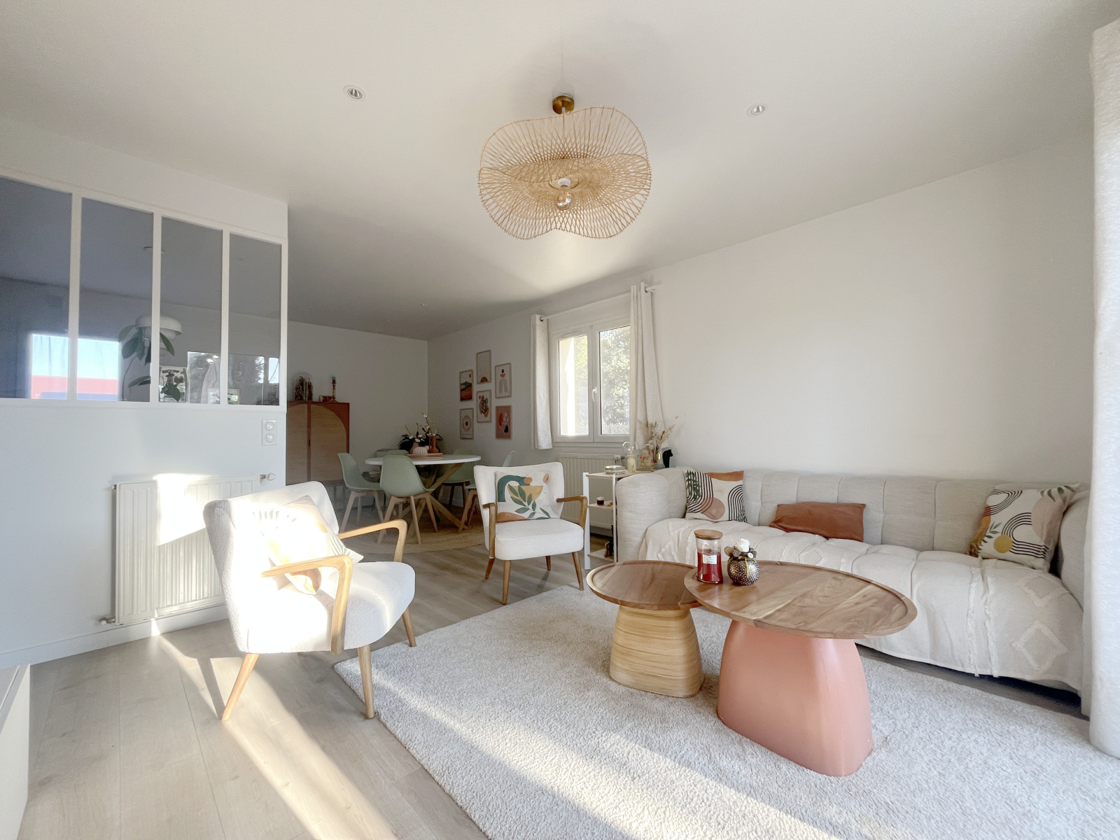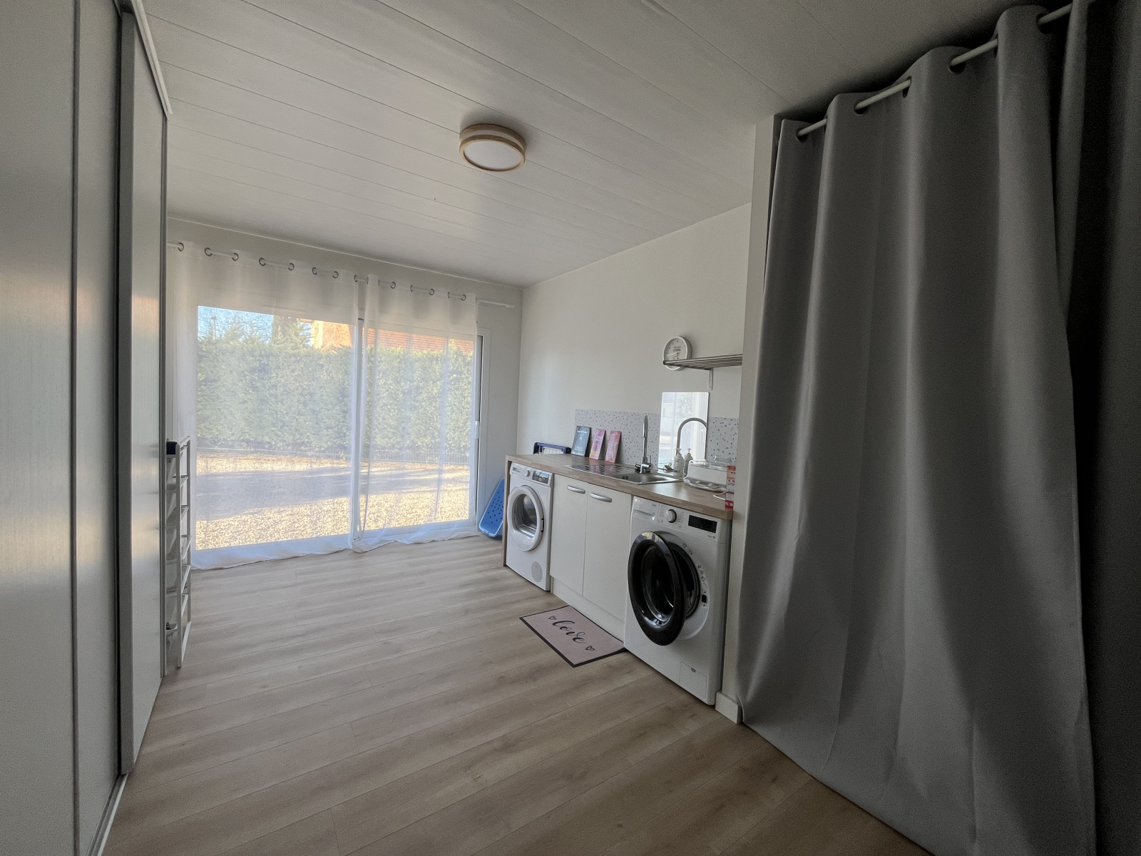 Une entrée, un séjour, salle à mager et cuisine américaine entièrement équipée, une chambre avec grand dressing, un garage transformé en buanderie chauffée, une salle d'eau.